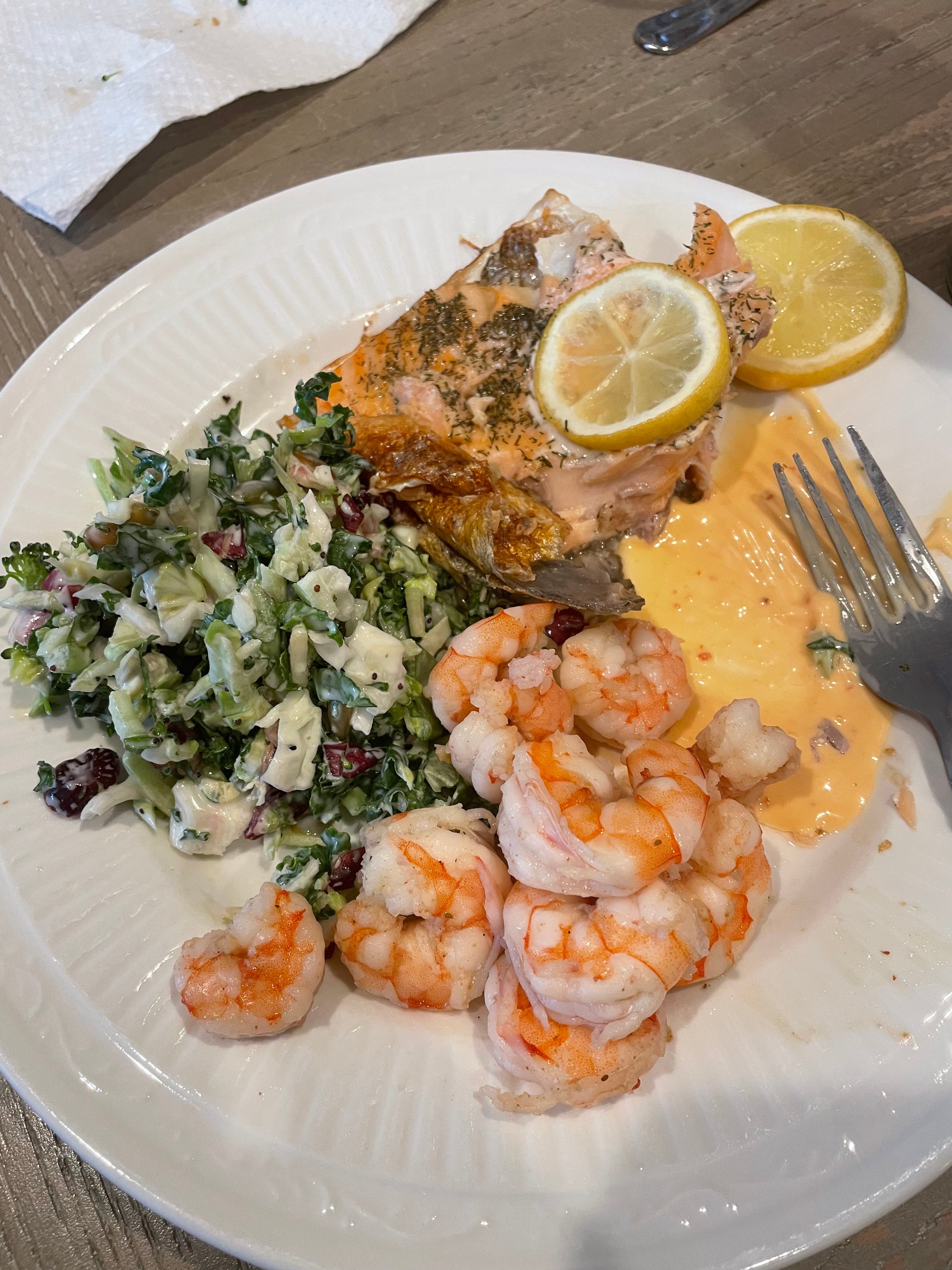 Last nights dinner - salmon, shrimp, sweet potatoes (not pictured), kale slaw