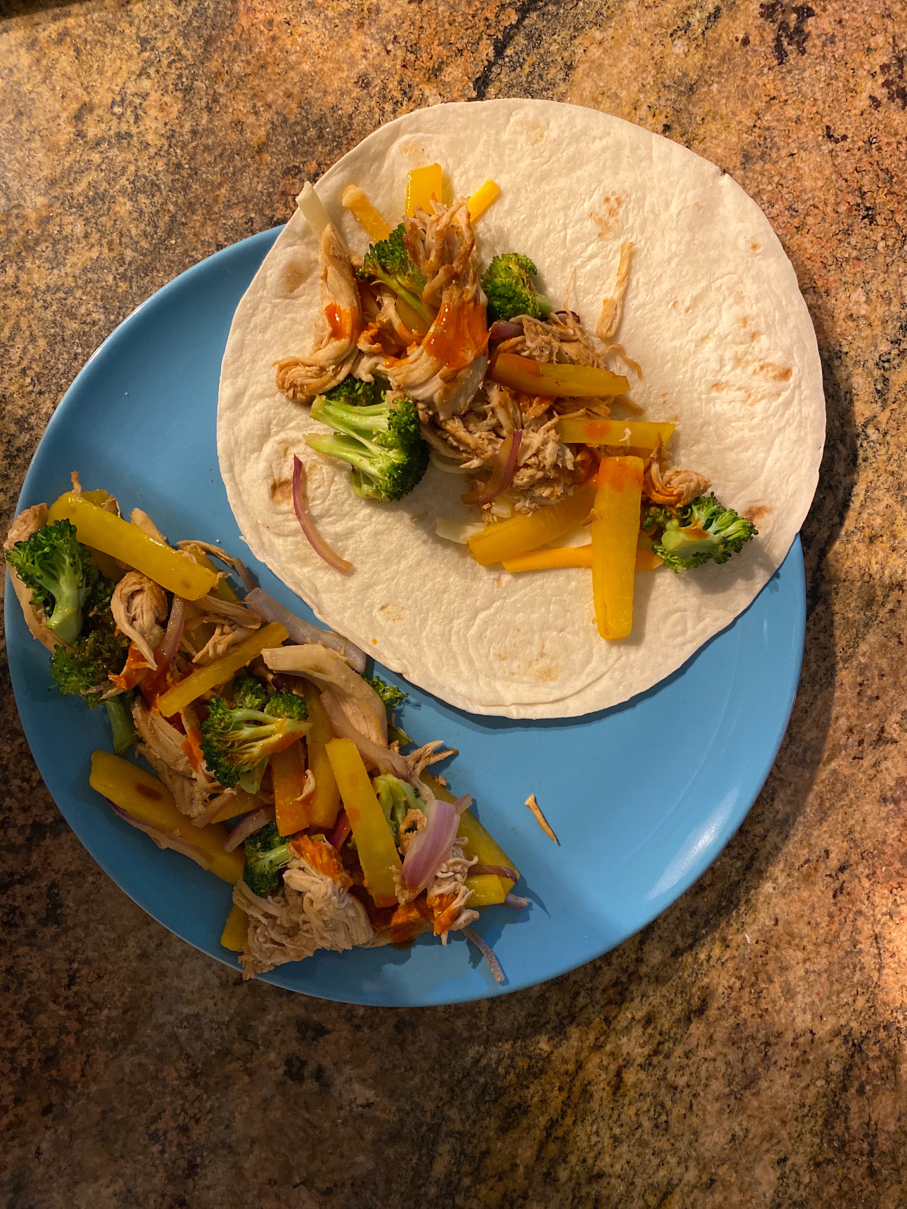Pulled chicken, broccoli, onion, bell pepper and a lil cheese :)